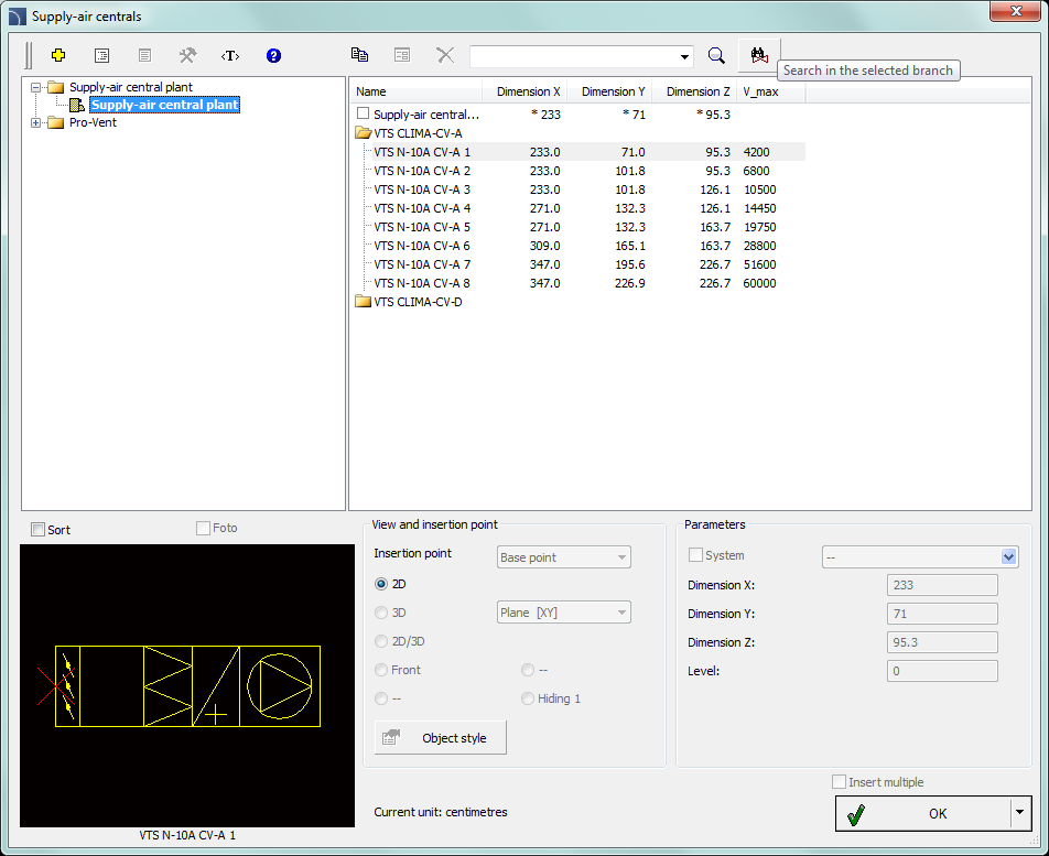 The Supply - air centrals command allows insertion of air centrals in 2D view.