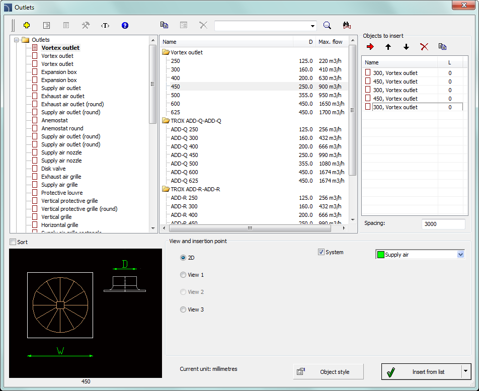 The Outlets command allows insertion of outlets, ventilators, exhaust units, fans, air intakes and other ventilation elements.