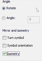 After selecting the Isometry option, the meaning of rotation and mirror controls changes. The default symbols insertion angle is the isometric angle that is defined in the CADprofi options.