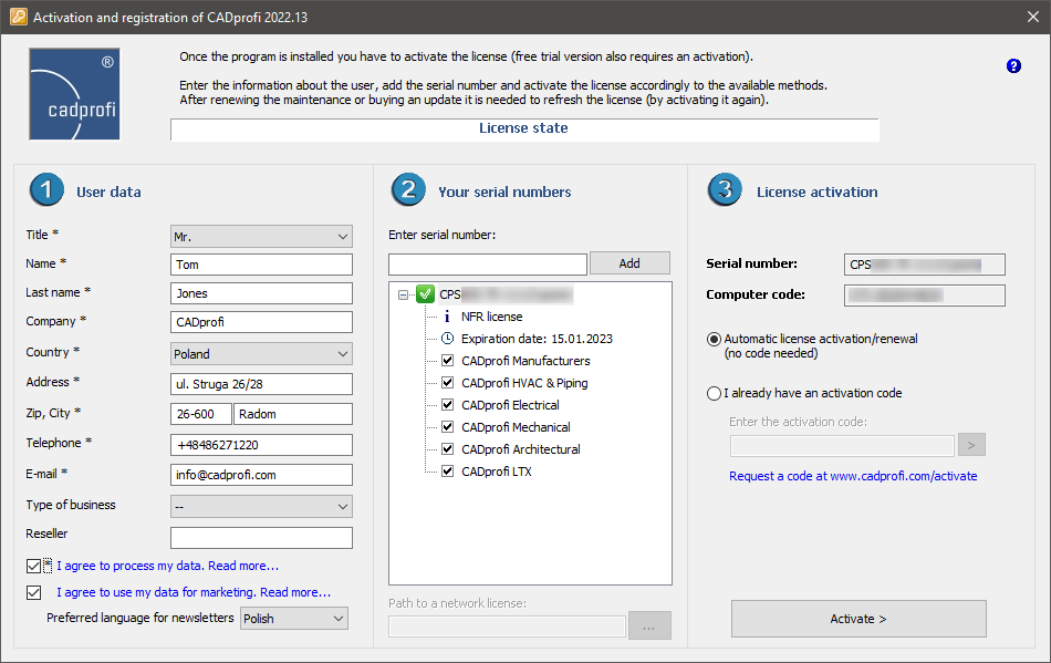 Enter serial number - serial number of your license. This number can be found in the CADprofi package or in the email that will be sent after program purchase.