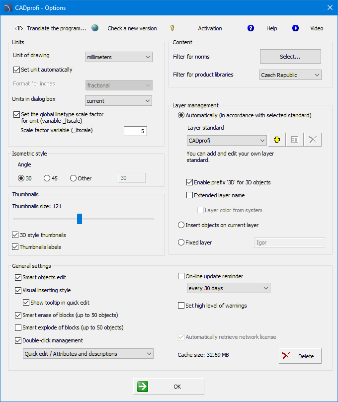 CADprofi - Options dialog window