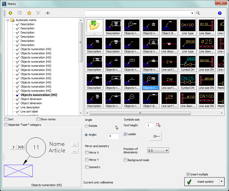 An example of such multivariant symbol is the "Objects numeration" symbol. This symbol can number objects and also retrieve from them required parameters (e.g. name, type etc.). In this way it is possible to quickly number many objects and insert required text in the drawing.