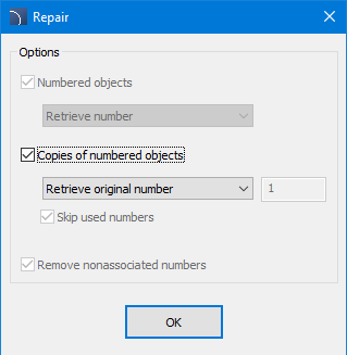 Retrieve original number - this option allows user to restore the original number. If objects were copied within a given drawing, this option will result in objects with duplicate numbers in the drawing.