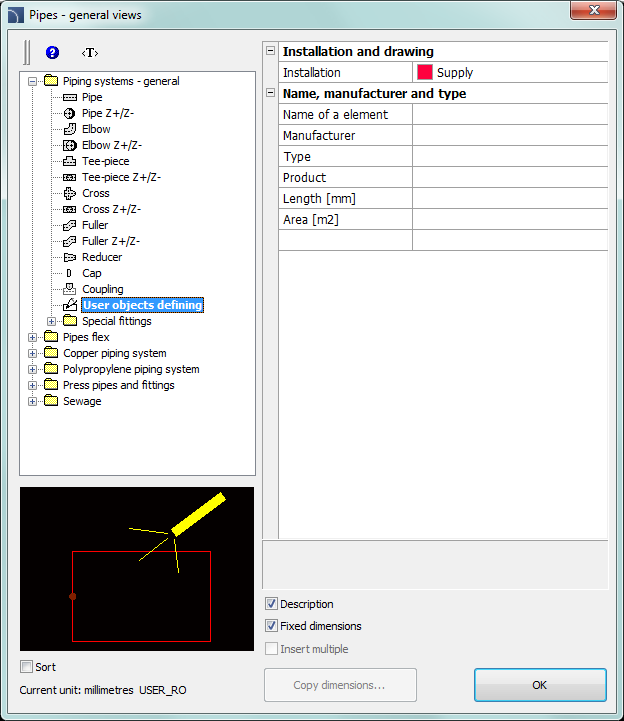 In order to define a new additional fitting, user should draw it first and then run the Pipes\Ducts - general views command. After that user should choose the User object defining option.