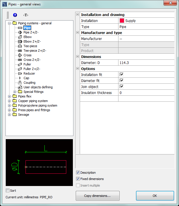 Fixed dimensions - enables/disables the preserve of a basic dimension after inserting objects such reducers. After inserting such element in which the line dimension is being reduced in the next time user runs the command the application will automatically change the default diameter into a reduced diameter (D2). This process is very convenient when designing an installation sequence. However, if user wants to insert a fitting that has an unchanged main cross-section, then enabling the Fixed dimensions option will prevent an automatic change of cross-section.