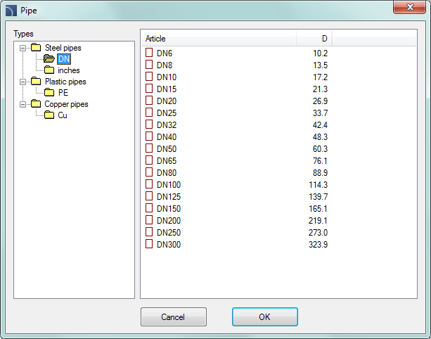 Pipes - general views dialog window
