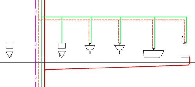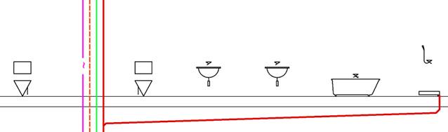 The first step is to draw a schematic cross-section of the ceilings. The cross-section can be drawn using the Walls command (see p. 142) or with regular lines. In the next step, run the Pipes Schematic command (see p. 196) and draw the water and sewage risers. Then you can insert the sanitary fixtures.