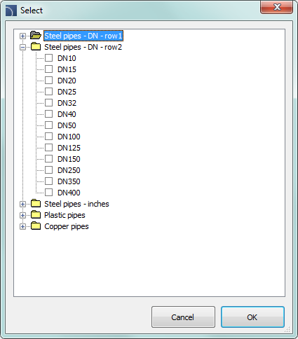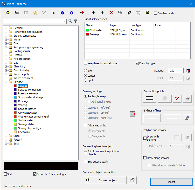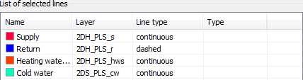 Both commands - Pipes - scheme and Ducts - scheme makes it possible to draw one or more schematic lines. The process of drawing a single line is possible after selecting in the dialog window the desired line and clicking the OK button. Doing so however does not allow to change drawing settings. These options are available only when adding line to the List of selected lines, which is also used for drawing multiple lines.