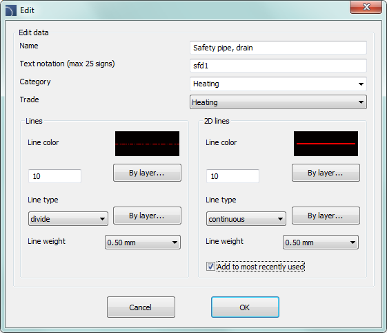 In CADprofi program pipe and ventilation lines can be drawn as schematic (with use of lines or polylines) or in 2D view. Therefore, when editing properties it is possible to specify different parameters for schematic lines as well as for lines in 2D view.