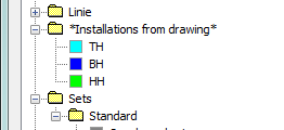 When several designers are working on the same project, then it is possible that one of these designers has used his own line kinds and then has forwarded the drawing to further edition. In this case, CADprofi application will automatically detect the presence of additional lines (installation kinds) and will display them in a new category called Installations from drawing. Name of the new lines that were identified from the drawing are being taken from their label (ending of the layer's name). If these lines' parameters will be edited in the dialog window, then they will be permanently saved in the program's database as user's lines.