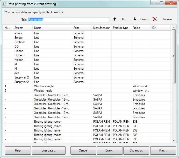 In this data window it is possible to sort the data, set the column width that will be used for printing and delete any rows or columns or hide unnecessary data.