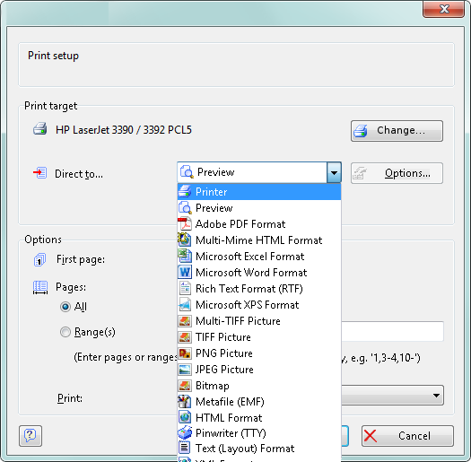 A useful option is a possibility to print the first page of specification on another printer than other pages. This option can be used to print the first page that contain the company logo on a color printer and other pages on a monochrome printer.