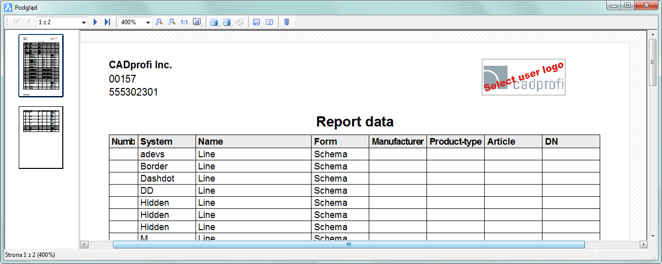 •Header of a company - enable/disable the printing of the header of a company on the first page of BOM. The data needed for the header and the company logo are being defined in the next dialog window that contains the initial printing preview.
