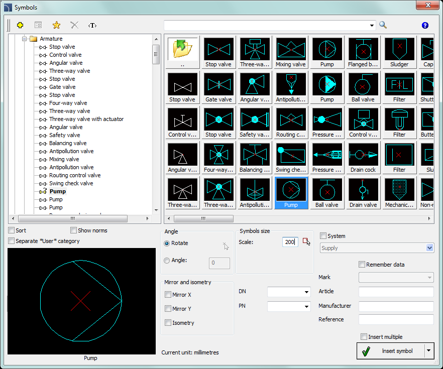 •Isometry - enabling this option will convert the symbol, so it will possible to use it in isometrical schemes.