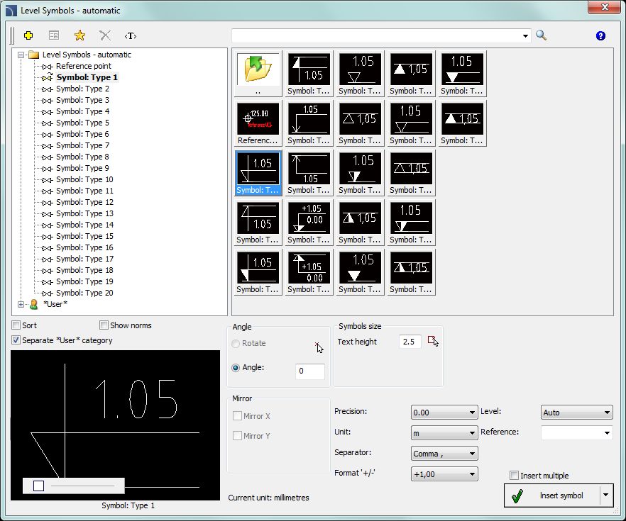 Precision of dimensions - defines the decimal number of the ordination values in the symbol that’s going to be inserted.