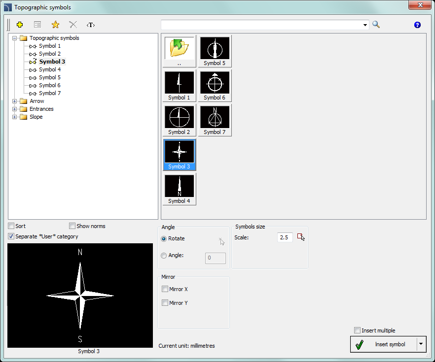 The Topographic symbols command allows to insert into the drawing many different symbols such as: arrows, cardinal direction symbols, slopes and others.