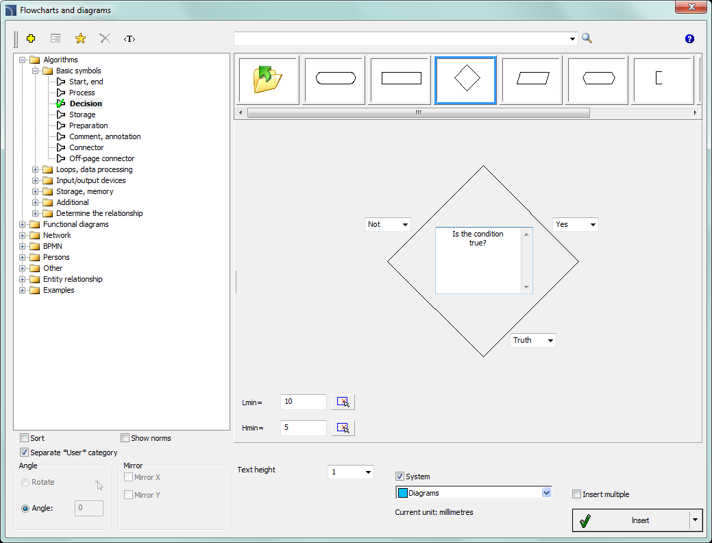 Many block diagrams elements has got edit fields, in which it is possible to enter a variety of texts. Program automatically adjusts the size of elements that are inserted into the drawing depending on the text length. If user needs to edit the text, then he can use the Edit symbols command, thanks to which after making the edition the block size will be updated. It is also possible to determine the minimum size of the block, so even when adding small amount of texts, the size of individual elements will be similar.