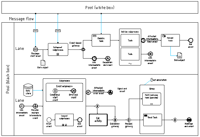 Program can draw BPMN diagrams. Business Process Modeling Notation is a graphical way of showing business processes.