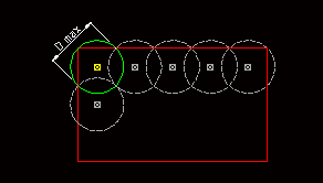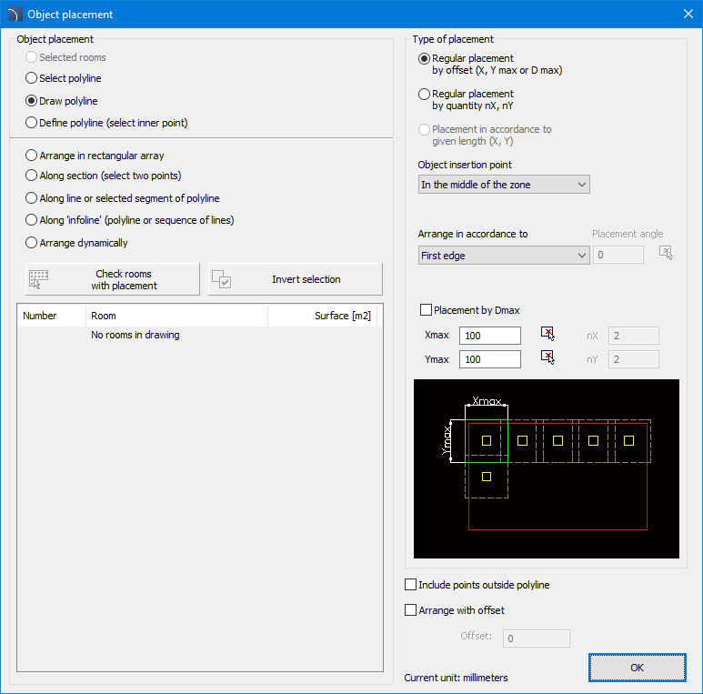 Regular placement by offset (X, Y, max or D max) - a mode in which the number of columns and rows of the distribution will be selected so that it does not exceed the specified values of XY spacing or R radius. This option is recommended when the placed element has an operating range (e.g. a sensor).