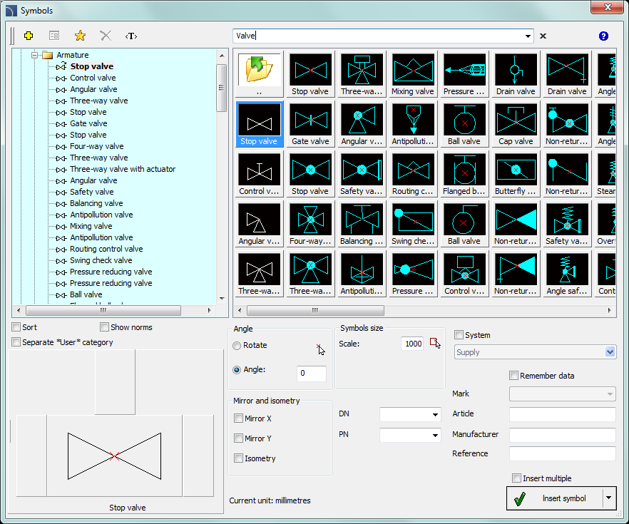 • • •Turn symbol allows to insert a reverse symbol, e.g. directed in opposite direction. •Symbol orientation allows to insert a symbol, that is rotated with respect to the selected isometry axis. |