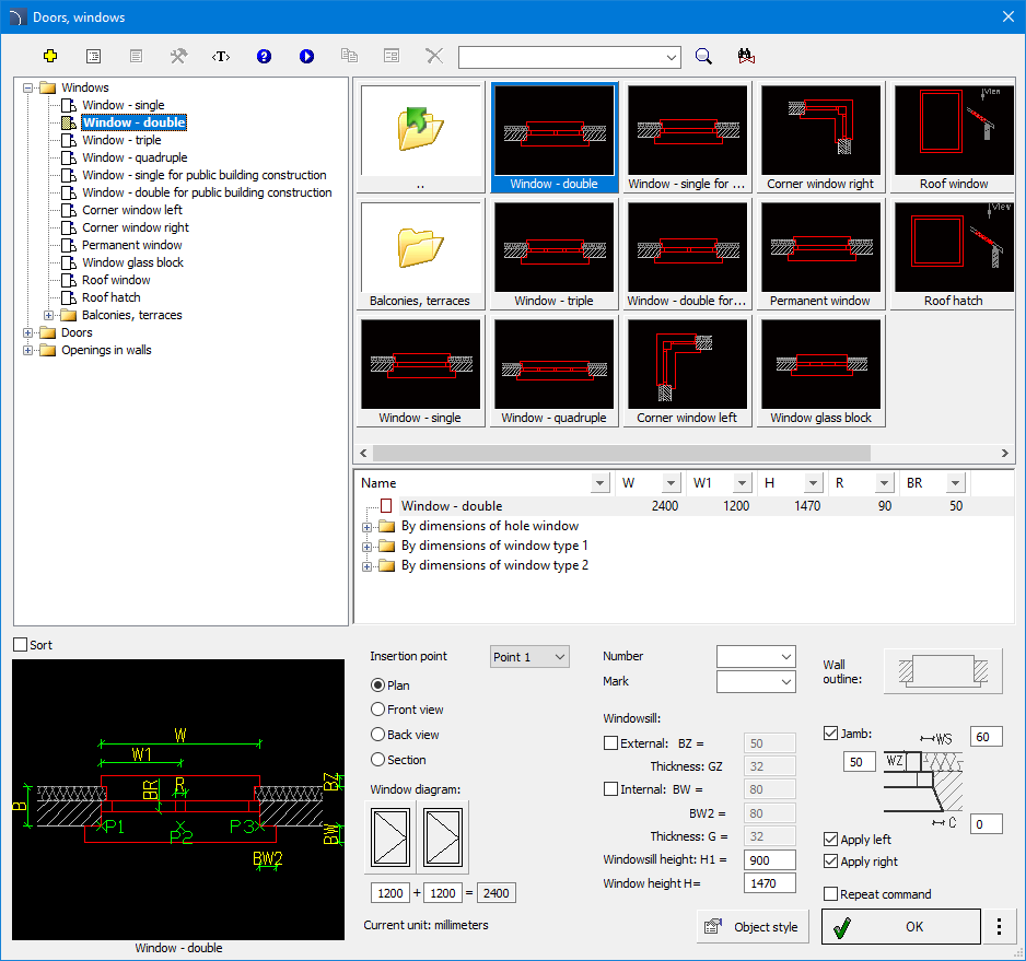View and insertion point - view selection and object insertion points. For all library objects a primary view is available (mostly 2D). Additional views are available only for some objects (e.g. Internal window jamb and External window jamb are available only for plan windows).