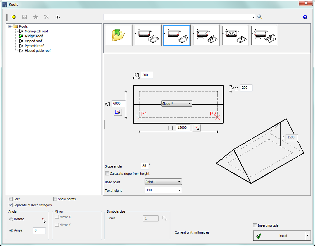 Roofs command allows to quickly insert to the drawing the selected type of roof with user specified dimensions. During the block insertion, application automatically calculates the actual slope area, and its value is available in attributes.