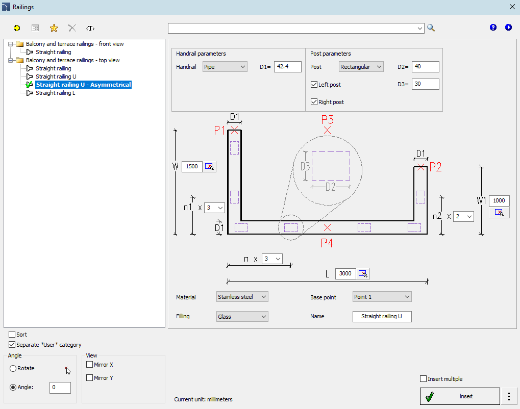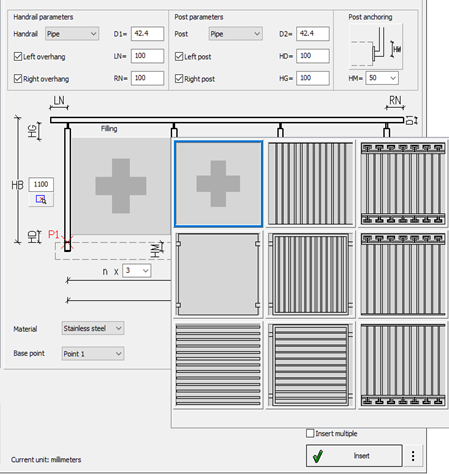 2. In the dialog box, create a railing by selecting its parameters, dimensions, fill, material and insertion base point.