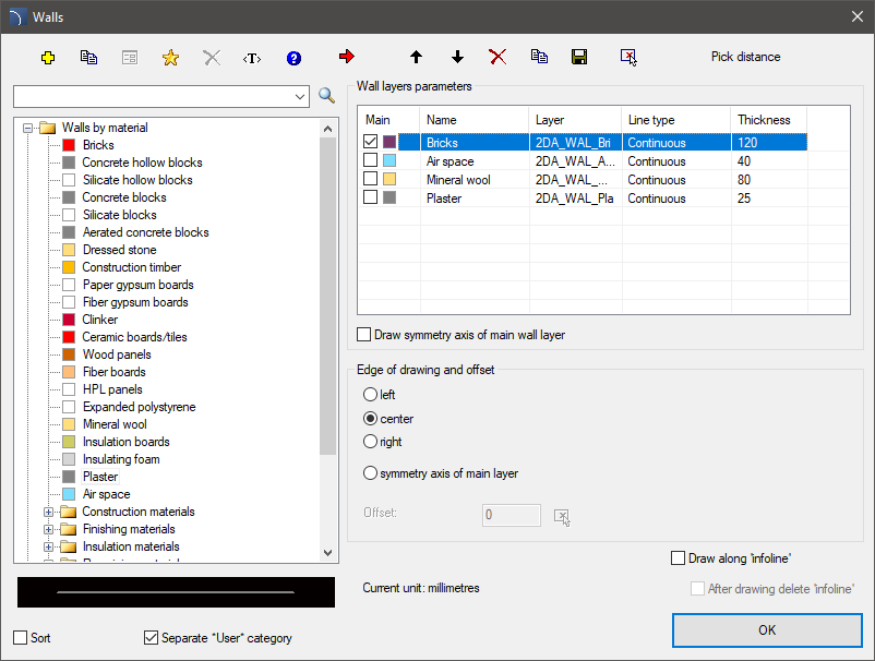 Drawing single layer walls is possible after selecting the needed wall type and clicking the OK button. Such a process however does not allow to change drawing settings and wall thickness. These options are only available for walls that were added to the list that contain a wall definition. This list also allows for drawing of composite walls.