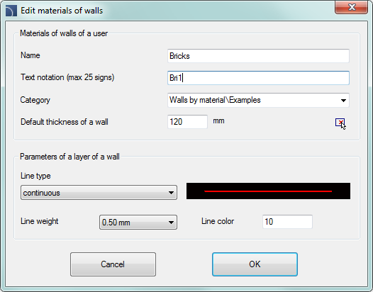 Wall layer parameters - CAD settings for the layer, on which the selected wall type will be drawn. User should specify the color and both the line width and type for the appropriate layer.