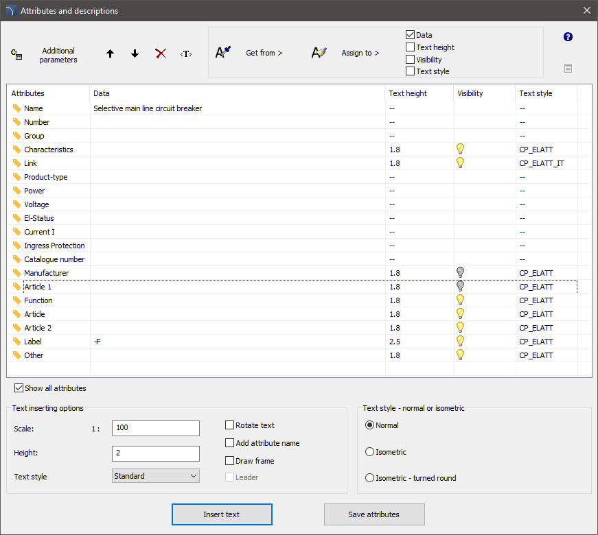 Get from > - allows user to get for the selected attributes: data, text height, visibility or text style, from the object indicated in the drawing. If the specified object does not have any parameters or their value is empty the operation will not be performed.