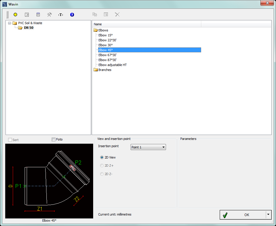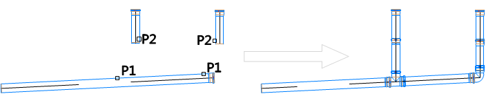 • During the insertion of the selected fitting to the drawing. In this case after attaching the fitting to the selected element (P1) it is possible to indicate another element (P2). If the indicated elements are "compatible" then the program will connect them.
