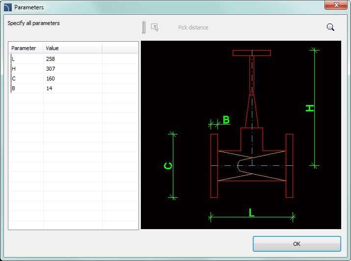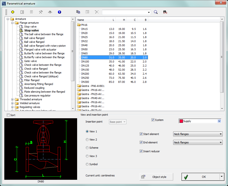 The Parametrical armature command allows to insert to the drawing armature views, "in-line" pumps and other piping objects. For each element, databases are available that contain standardized elements and elements based on manufacturers types. All elements are parametrical objects. It means that when user inserts an object into the drawing, he has the possibility to determine dimensions such as length, width, connection sizes or the dimensions of a manual valve knob as well as other dimensions. This feature gives user a lot of opportunities, because through self-determination of dimensions, user can use any devices, even those that are not available in standard program databases.