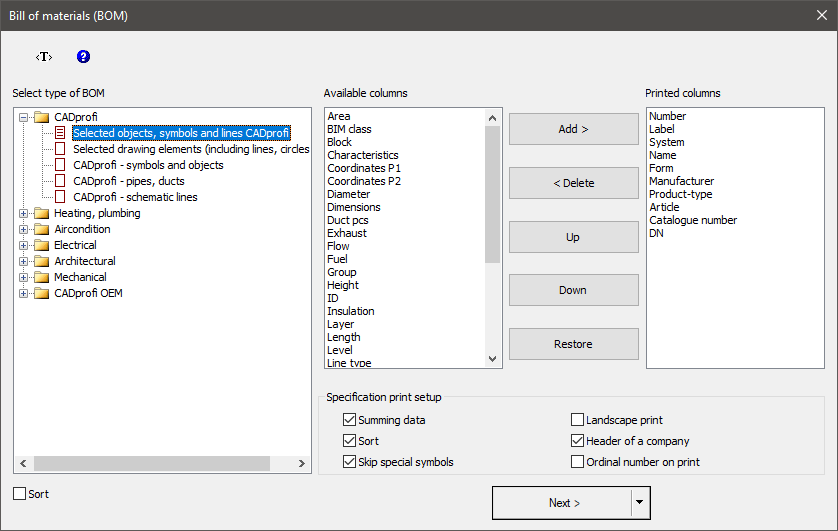 Restore - allows user to restore default list and positions of printed columns according to template lists of BOM.