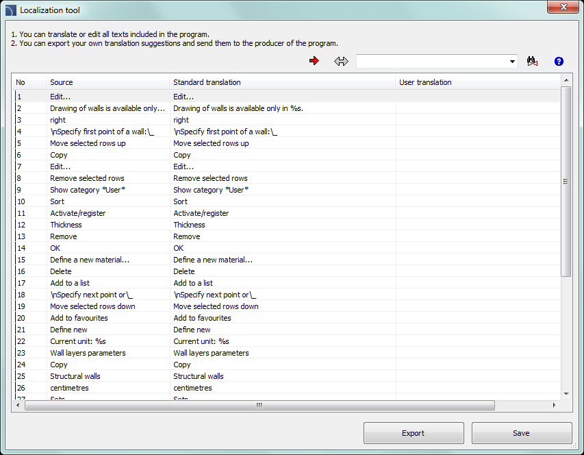 When translating contextual translations, the system record all texts that are used by the program and make them available for translation. In this way it is possible to translate all texts, which are visible when user "normally" uses the program. Apart from standard texts, CADprofi program also contains many additional messages that appear sporadically (such as messages about the improper program operation). The best way to translate these texts is display a full table of texts in which user can easily find the text that requires translation.