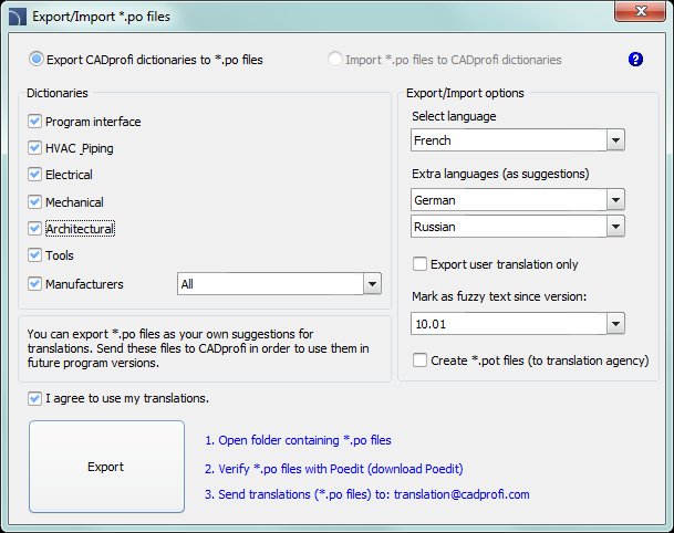 After translating the user interface, and the program content it is possible to export translations to files in PO format and send them to CADprofi, as suggested translations, thanks to which they will be available in future program updates.