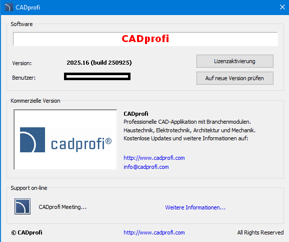 Das Dialogfenster CADprofi - Info enthält grundlegende Informationen über die aktuell verwendete Programmversion. Der Befehl ermöglicht dem Benutzer, sowohl seine Lizenz zu aktivieren und das Programm registrieren, als auch das Programm zu aktualisieren.