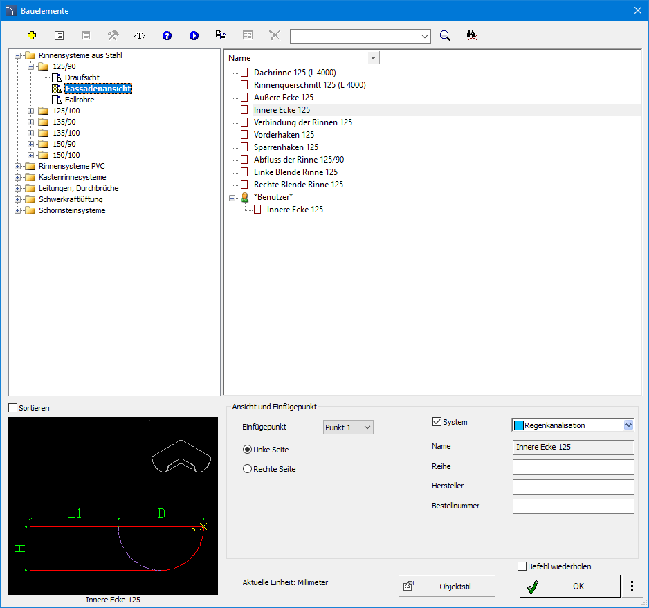 Der umfangreiche Inhalt der Bibliothek ermöglicht die Planung von Rinnensystemen in Seiten- und Draufsicht. Die Bibliothek umfasst Ecken, Verbinder, Rinnenhaken, Fallrohre, Bögen, Schellen, Sedimentfallen, Regenwasserauffänger und Rinnenböden.