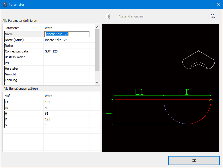 alle seine Abmessungen im Dialogfeld „Parameter“
