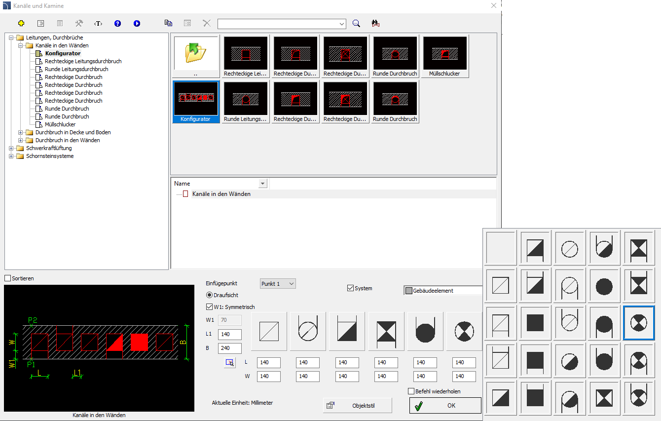 2. Wählen Sie im Dialogfeld Kanäle und Kamine die gewünschte Objektkategorie, woraufhin eine Vorschau des Objekts angezeigt wird und eine Liste aller verfügbaren Typen oder Größen in der Detailliste erscheint.