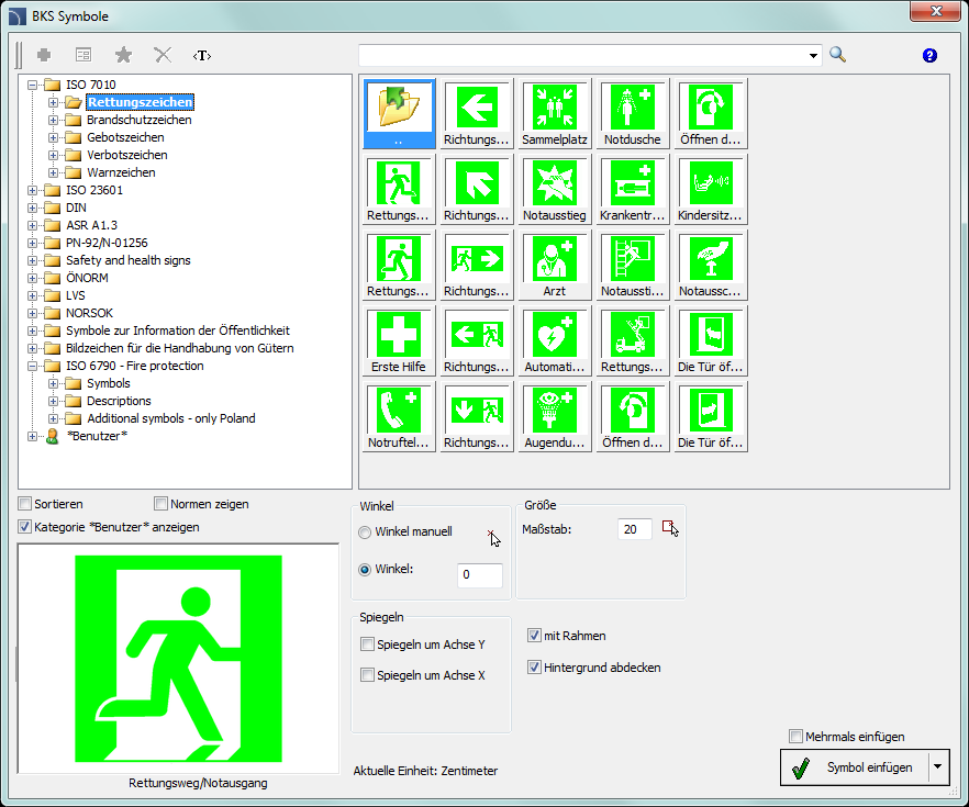 Der Befehl BKS-Symbole ermöglicht eine Vielzahl von Kennzeichen für Brandschutz, Katastrophenschutz und Sicherheitstechnik in die Zeichnung einzufügen. Dieser Befehl enthält auch öffentliche Informationssymbole sowie viele andere.
