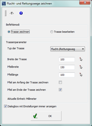 Dialogbox mit Einstellungen immer anzeigen – aktiviert/deaktiviert die Anzeige des Dialogfensters nach Aufruf des Befehls Flucht- und Rettungswege zeichnen. Wird das Fenster nicht angezeigt, wird die Trasse mit den vorigen Einstellungen gezeichnet. Um das Dialogfenster einzuschalten, muss nach Befehlsaufruf die Option Einstellungen (Schalter E) aufgerufen werden.