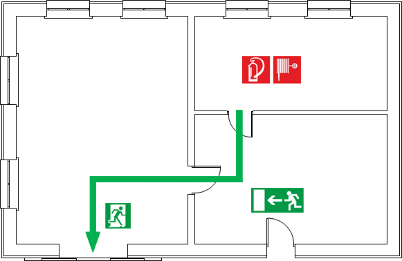 Ein Beispiel für einen Flucht- und Rettungsweg, Rettungs- und Brandschutzsymbole.