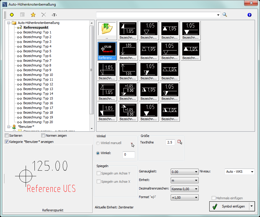Niveau – bestimmt den Bezugspunkt des Symbols auf ein Koordinatensystem. Folgende Möglichkeiten zur Festlegung der Koordinatensysteme sind möglich:
