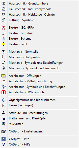 Ein umfangreicheres Programm ist die Vollversion von CADprofi, das auch die entsprechenden CP-Symbols-Module enthält (z.B. hat CADprofi Electrical deutlich mehr Funktionen und Bibliotheken, als die Bibliothek CP–Symbols Electrical).