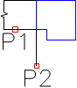 Einfügen eines Kanals mit der Option „An Objekt anschließen”. 1. Objekt zeigen, an das ein Kanal angeschlossen werden soll (P1). 2. Angabe der Länge des neuen Kanals (P2). |