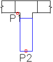 Automatische Einfügung am Ende des Kanals. 1. Zeigen Sie auf den Kanal, an den Sie ein Bogen einfügen wollen (P1). 2. Geben Sie die Richtung des Bogens an (P2). |