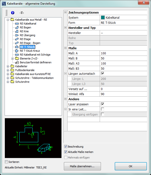 Dialogfenster Kabelkanäle - allgemeine Darstellung