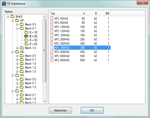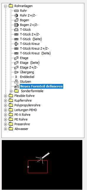 Nach Auswahl eines Herstellers oder einer Norm erscheint ein Dialogfenster mit den verfügbaren Formstücken oder Leitungen.