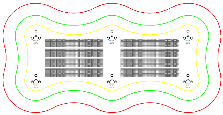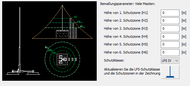 Bemaßung – ermöglicht eine genaue Bestimmung der Mastschutzzonen nach der Kegelmethode (Schutzwinkel) für einen einzelnen Mast sowie nach der Rolling-Ball-Methode für einen einzelnen Mast und mehrere Masten in vier LPS-Schutzklassen. In jeder Phase des Projekts ermöglicht das Programm Anpassungen an den aufgestellten Masten, indem es die festgelegten Schutzzonen entsprechend den eingestellten Parametern (Höhe der geschützten Ausrüstung und LPS-Klasse) automatisch neu berechnet.