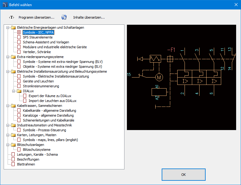 Der Befehl Elektro- und Steuerungsanlagen öffnet das Dialogfenster mit dem Sie die geeigneten Befehle aus dem Elektro Modul auswählen können. Dieser Befehl ist für Einsteiger vorbereitet. Im Dialogfenster neben der Liste aller Befehle finden Sie auch ein großes Vorschaufenster, in dem die ausgewählte Funktion grafisch dargestellt wird.